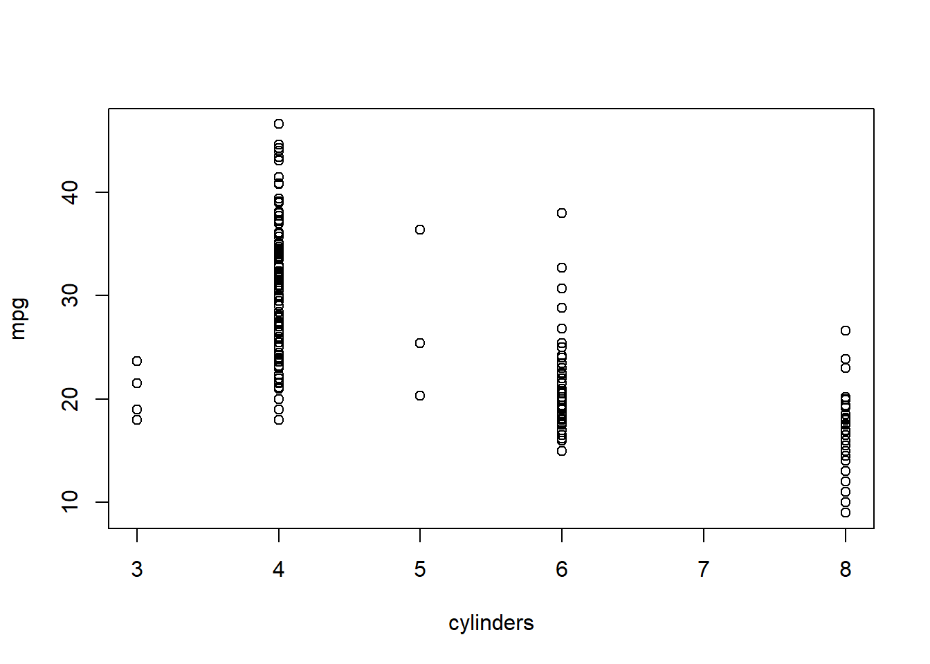 plot (cylinders, mpg, col= "red" , varwidth= T, xlab= "cylinders" , ylab= "MPG" )