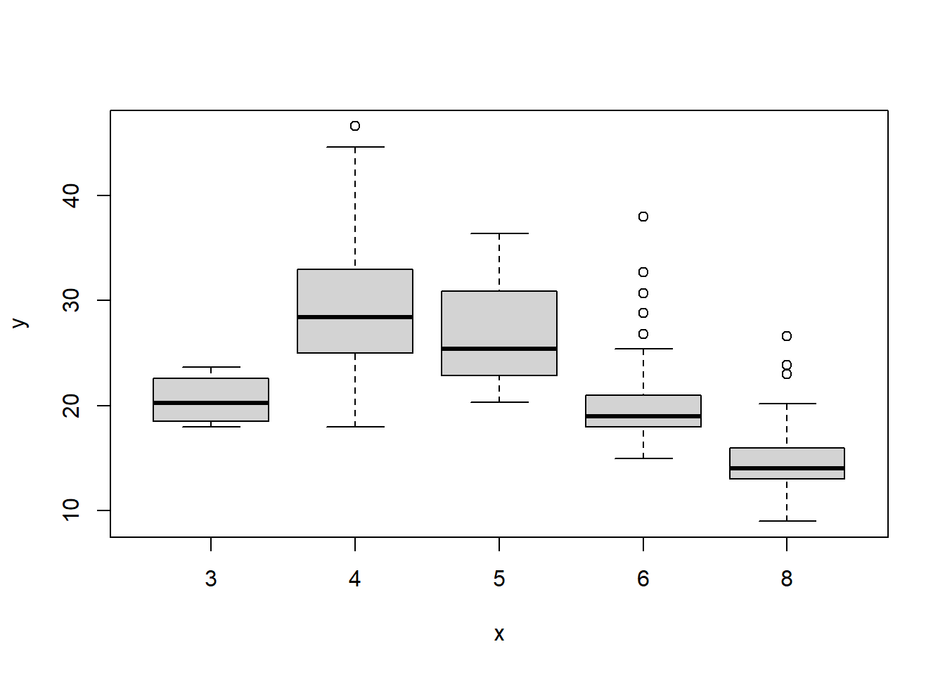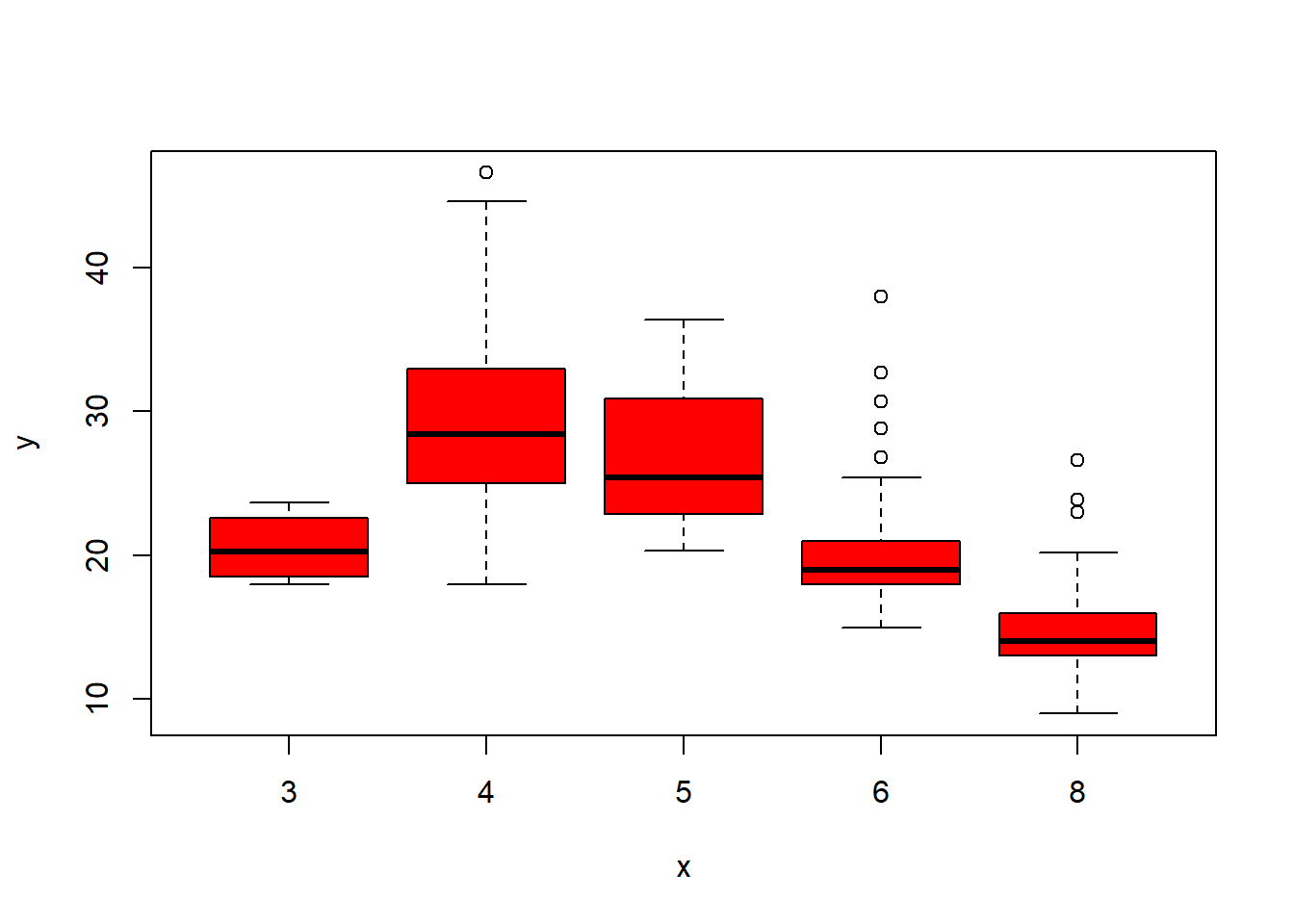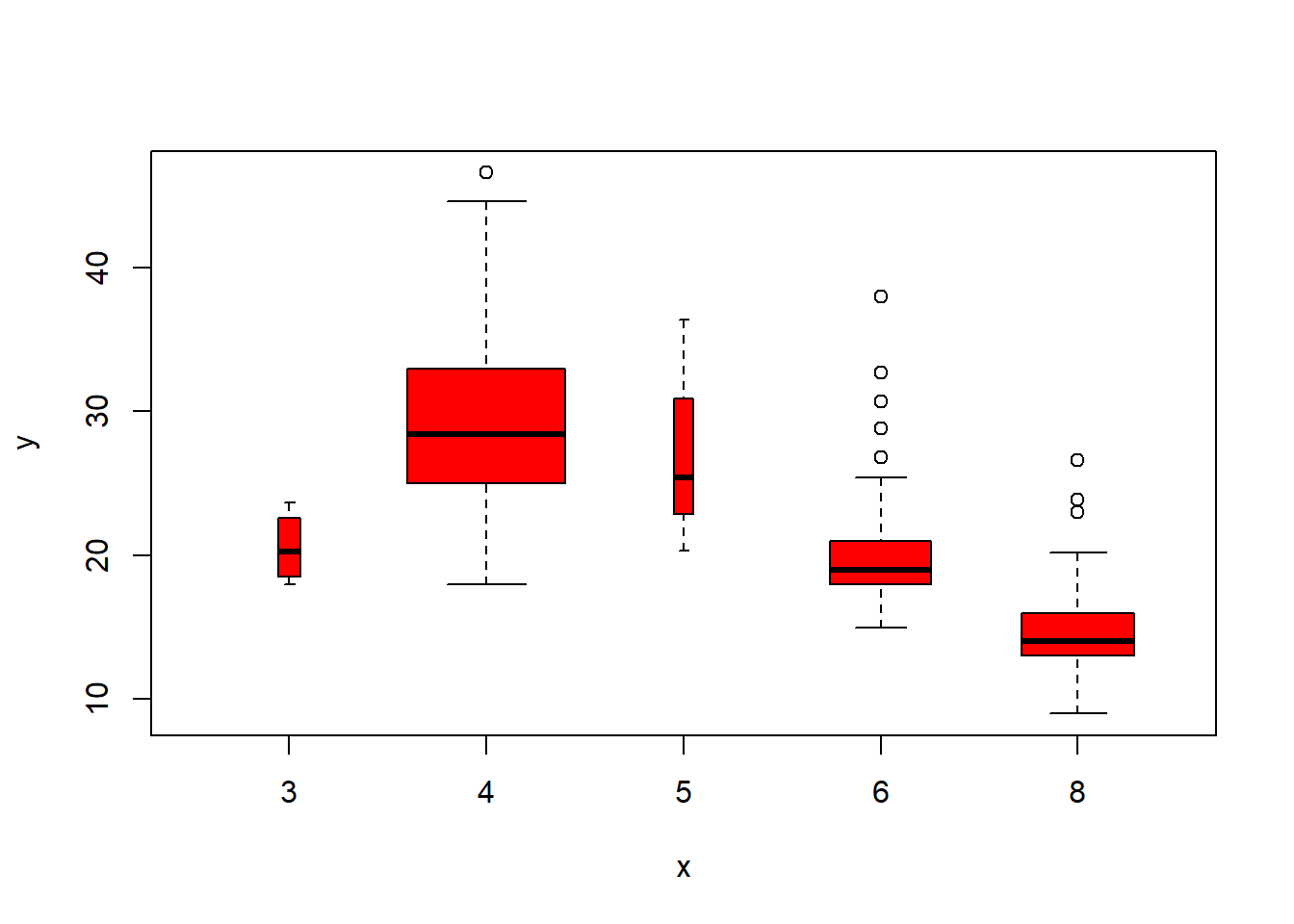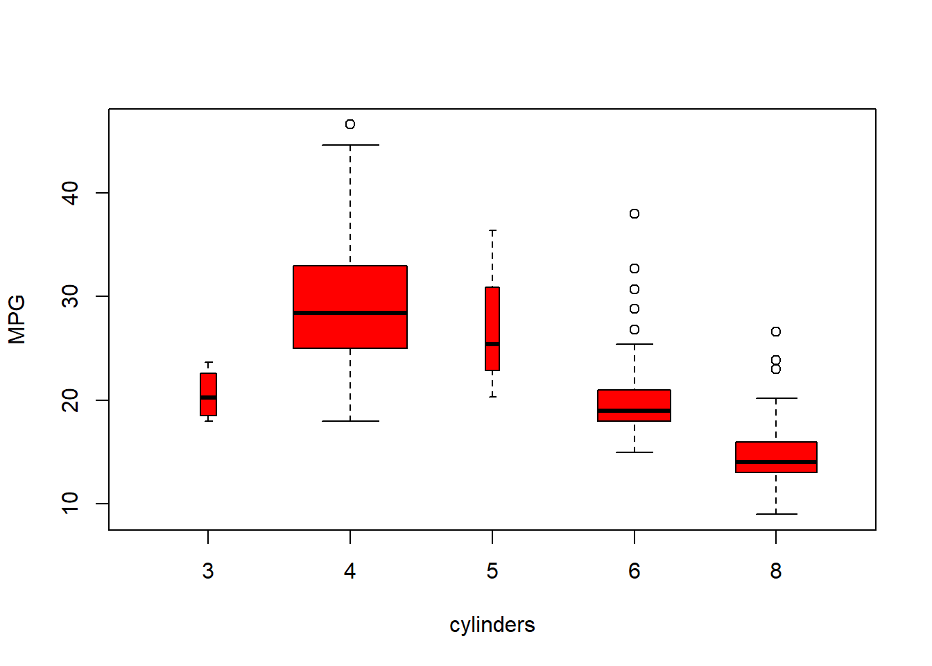 plot (cylinders, mpg, col= "red" , varwidth= T)