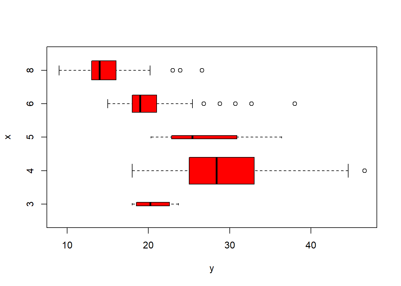 plot (cylinders, mpg, col= "red" , varwidth= T,horizontal= T)